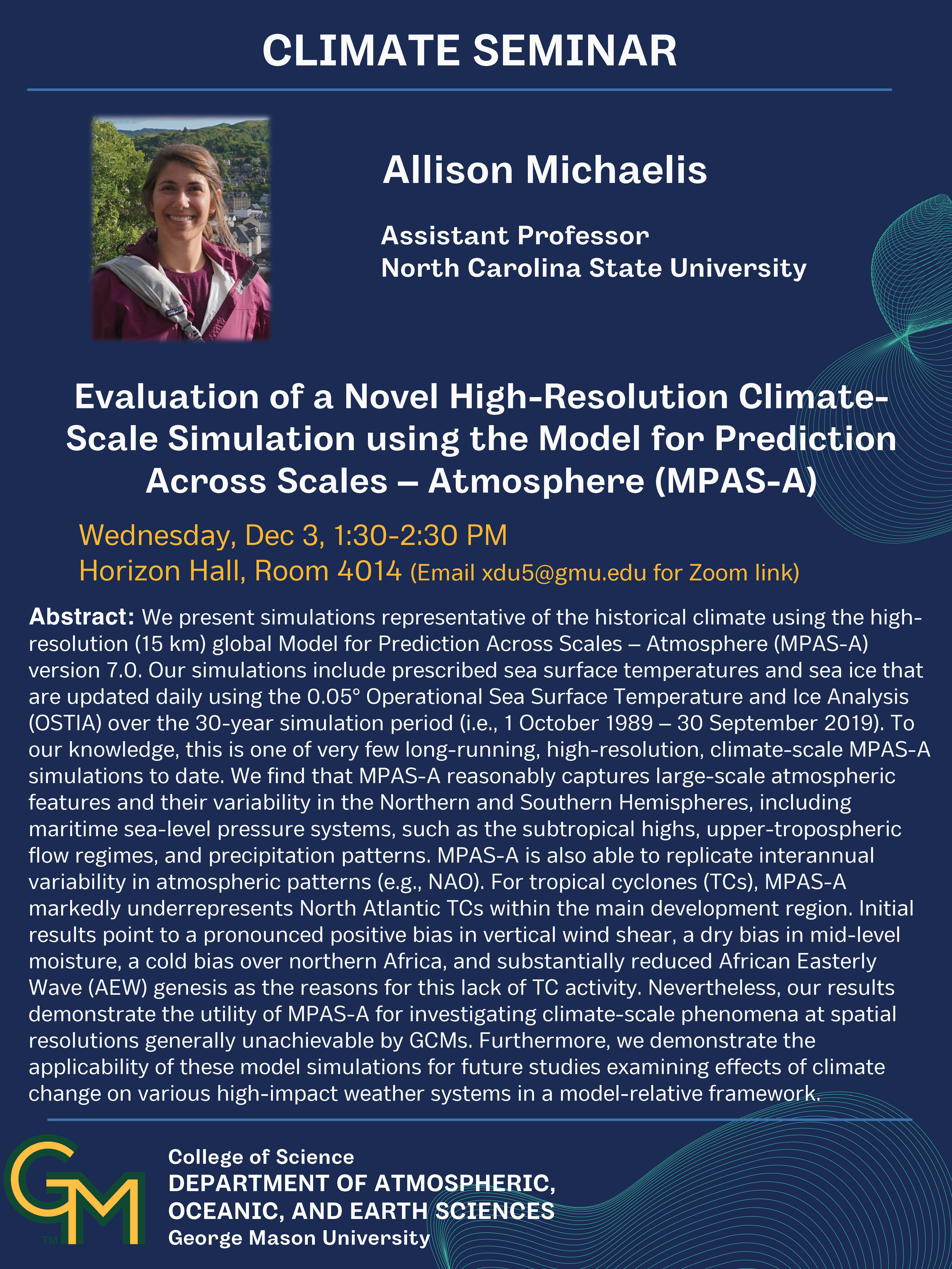 Abstract: We present simulations representative of the historical climate using the high-resolution (15 km) global Model for Prediction Across Scales – Atmosphere (MPAS-A) version 7.0. Our simulations include prescribed sea surface temperatures and sea ice that are updated daily using the 0.05° Operational Sea Surface Temperature and Ice Analysis (OSTIA) over the 30-year simulation period (i.e., 1 October 1989 – 30 September 2019). To our knowledge, this is one of very few long-running, high-resolution, climate-scale MPAS-A simulations to date. We find that MPAS-A reasonably captures large-scale atmospheric features and their variability in the Northern and Southern Hemispheres, including maritime sea-level pressure systems, such as the subtropical highs, upper-tropospheric flow regimes, and precipitation patterns. MPAS-A is also able to replicate interannual variability in atmospheric patterns (e.g., NAO). For tropical cyclones (TCs), MPAS-A markedly underrepresents North Atlantic TCs within the main development region. Initial results point to a pronounced positive bias in vertical wind shear, a dry bias in mid-level moisture, a cold bias over northern Africa, and substantially reduced African Easterly Wave (AEW) genesis as the reasons for this lack of TC activity. Nevertheless, our results demonstrate the utility of MPAS-A for investigating climate-scale phenomena at spatial resolutions generally unachievable by GCMs. Furthermore, we demonstrate the applicability of these model simulations for future studies examining effects of climate change on various high-impact weather systems in a model-relative framework.
