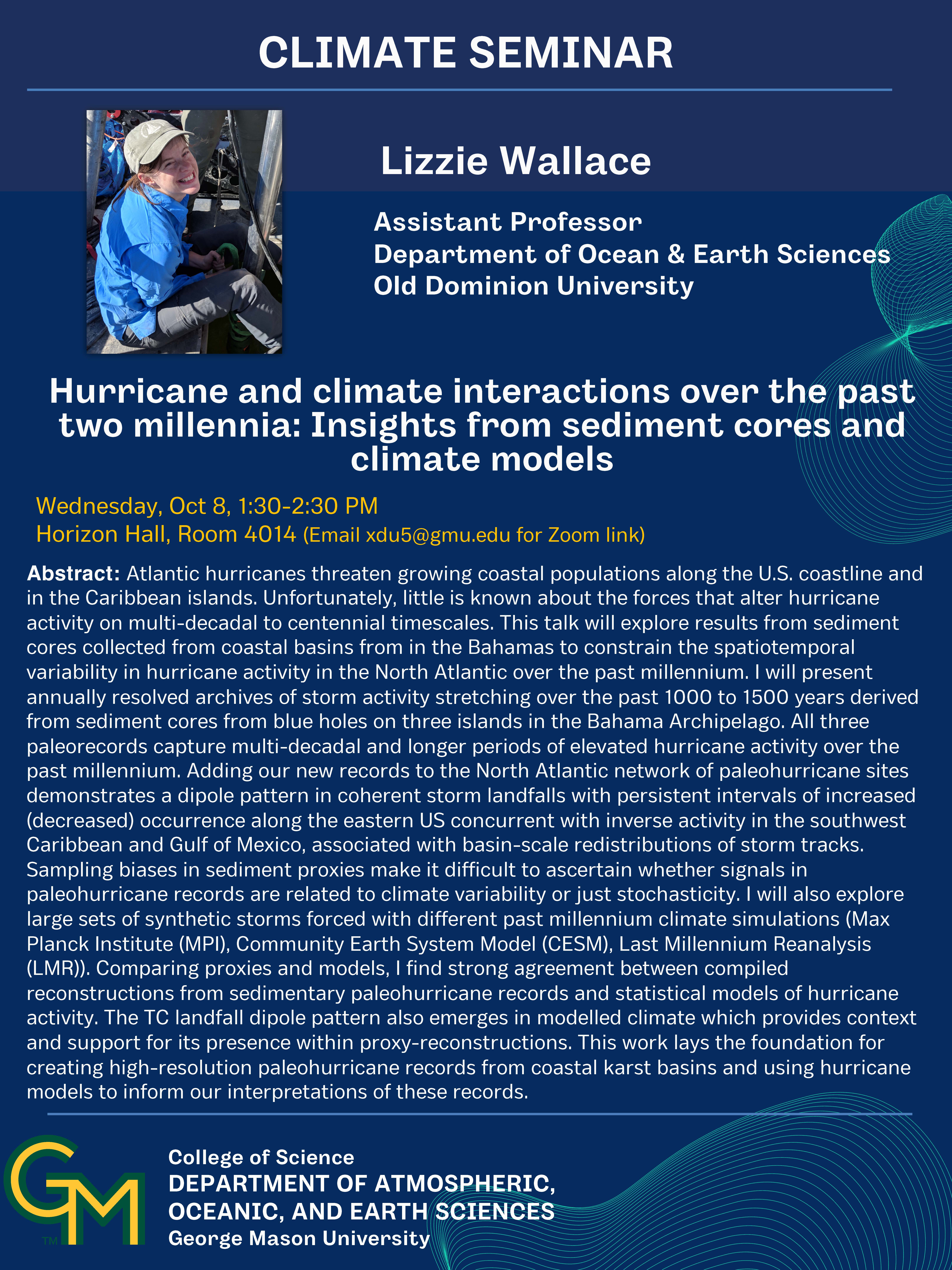 Abstract: Atlantic hurricanes threaten growing coastal populations along the U.S. coastline and in the Caribbean islands. Unfortunately, little is known about the forces that alter hurricane activity on multi-decadal to centennial timescales. This talk will explore results from sediment cores collected from coastal basins from in the Bahamas to constrain the spatiotemporal variability in hurricane activity in the North Atlantic over the past millennium. I will present annually resolved archives of storm activity stretching over the past 1000 to 1500 years derived from sediment cores from blue holes on three islands in the Bahama Archipelago. All three paleorecords capture multi-decadal and longer periods of elevated hurricane activity over the past millennium. Adding our new records to the North Atlantic network of paleohurricane sites demonstrates a dipole pattern in coherent storm landfalls with persistent intervals of increased (decreased) occurrence along the eastern US concurrent with inverse activity in the southwest Caribbean and Gulf of Mexico, associated with basin-scale redistributions of storm tracks. Sampling biases in sediment proxies make it difficult to ascertain whether signals in paleohurricane records are related to climate variability or just stochasticity. I will also explore large sets of synthetic storms forced with different past millennium climate simulations (Max Planck Institute (MPI), Community Earth System Model (CESM), Last Millennium Reanalysis (LMR)). Comparing proxies and models, I find strong agreement between compiled reconstructions from sedimentary paleohurricane records and statistical models of hurricane activity. The TC landfall dipole pattern also emerges in modelled climate which provides context and support for its presence within proxy-reconstructions. This work lays the foundation for creating high-resolution paleohurricane records from coastal karst basins and using hurricane models to inform our interpretations of these records.